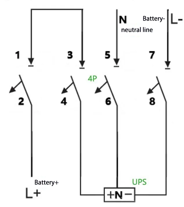 이자형:예: 40kVA 용량, 40개 셀의 정격 배터리 스트링 및 중성선 연결(균등 충전 전압: 14V × 40 = 560V, 즉 ±280V)을 갖춘 UPS의 경우 최대 작동 전류는 40kVA × 1.0 ¼ 90% ¼ 10V ¼ 40 = 111A로 계산됩니다. A 4P 750V 150A 회로 차단기를 채택할 수 있으며 두 극을 직렬로 연결합니다. 배선 방법은 다음과 같습니다.