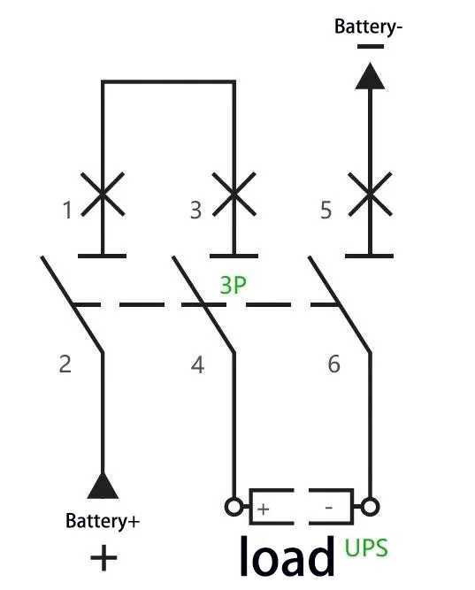 기음:예: 용량이 40kVA이고 정격 배터리 스트링이 40개 셀(균등 충전 전압: 14V × 40 = 560V)인 UPS의 경우 최대 작동 전류는 40kVA × 1.0 ¼ 90% ¼ 10V ¼ 40 = 111A로 계산됩니다. 2개의 극이 연결된 3P 750V 150A 회로 차단기를 채택할 수 있습니다. 시리즈로. 배선 방법은 다음과 같습니다.